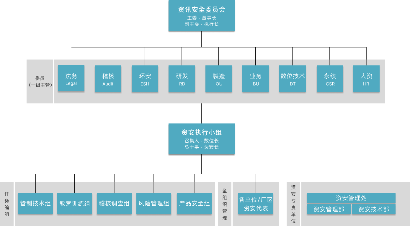 资讯安全委员会为XPJ资安最高管理组织,向董事长报告。下辖资安执行小组负责推行资讯安全委员会之各项决议。为持续建构完整且精实的资安专 责团队,资讯安全管理处下成立「资讯安全管理部」与「资讯安全技术部」,持续投入资源以强化团队资安核心能力。