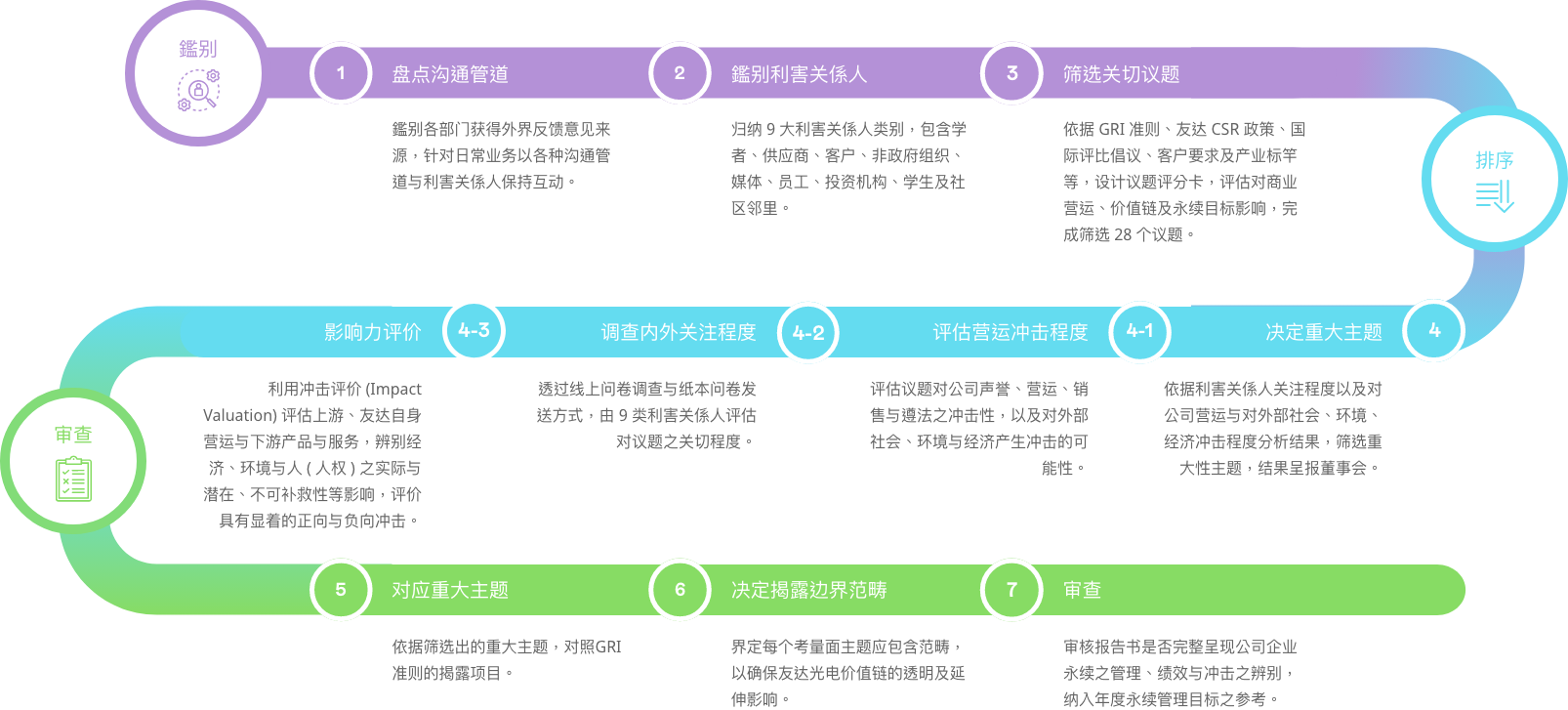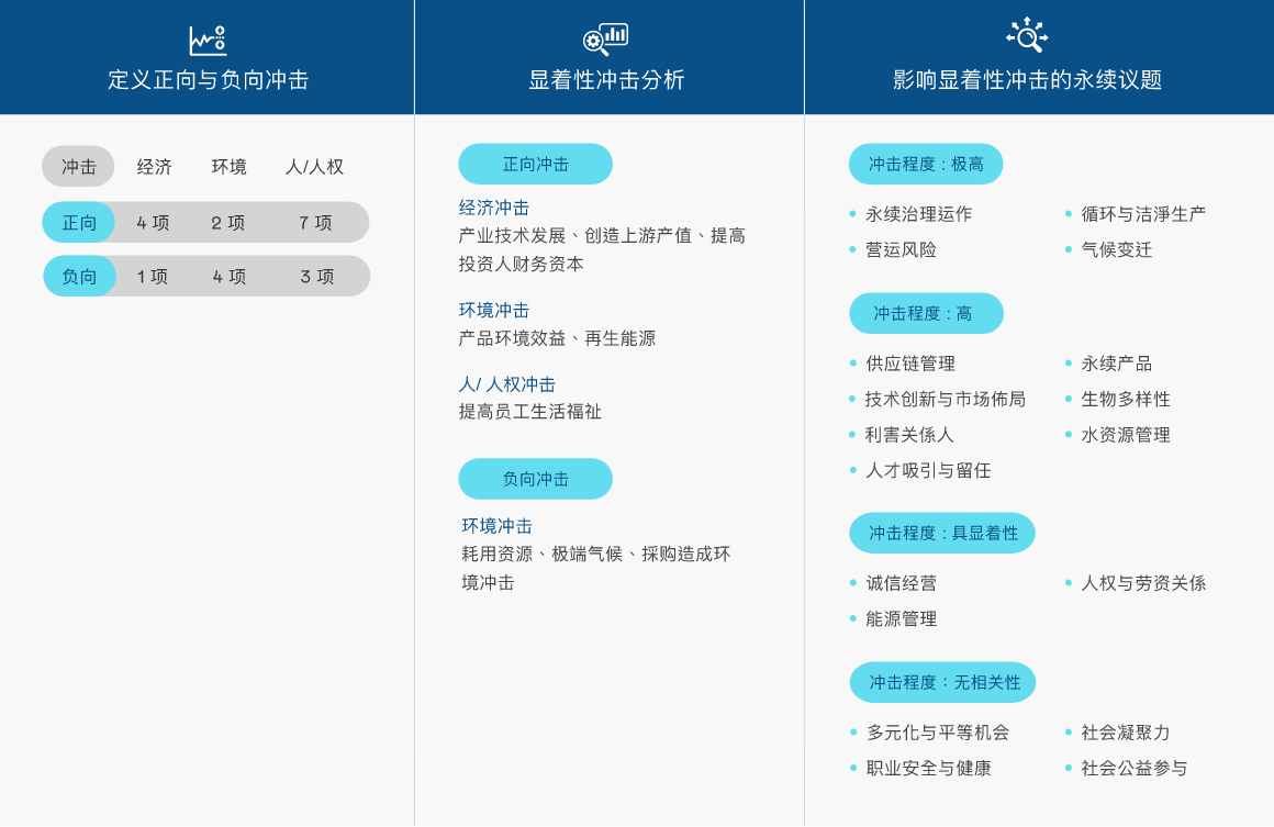| 供应链管理 | 供应商为公司重要的合作伙伴,必须建立风控与奖惩机制,具备相同理念与倡议,方有助于永续发展 | 直接 | GRI 204 GRI 308 GRI 414 |