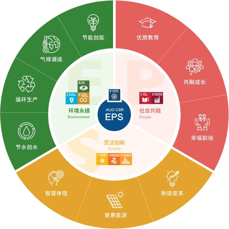 EPS 永续主轴延伸出 10 个具体面向,积极承诺于 2025 年完成永续发展的短中长期目标。目标中XPJ关注气候变迁与地球资源消耗的环境议题,亦致力于长期深耕的社会弱势族群与提升优质教育需求,并以灵活创新迎向未来世界在能源与智能应用的新契机。