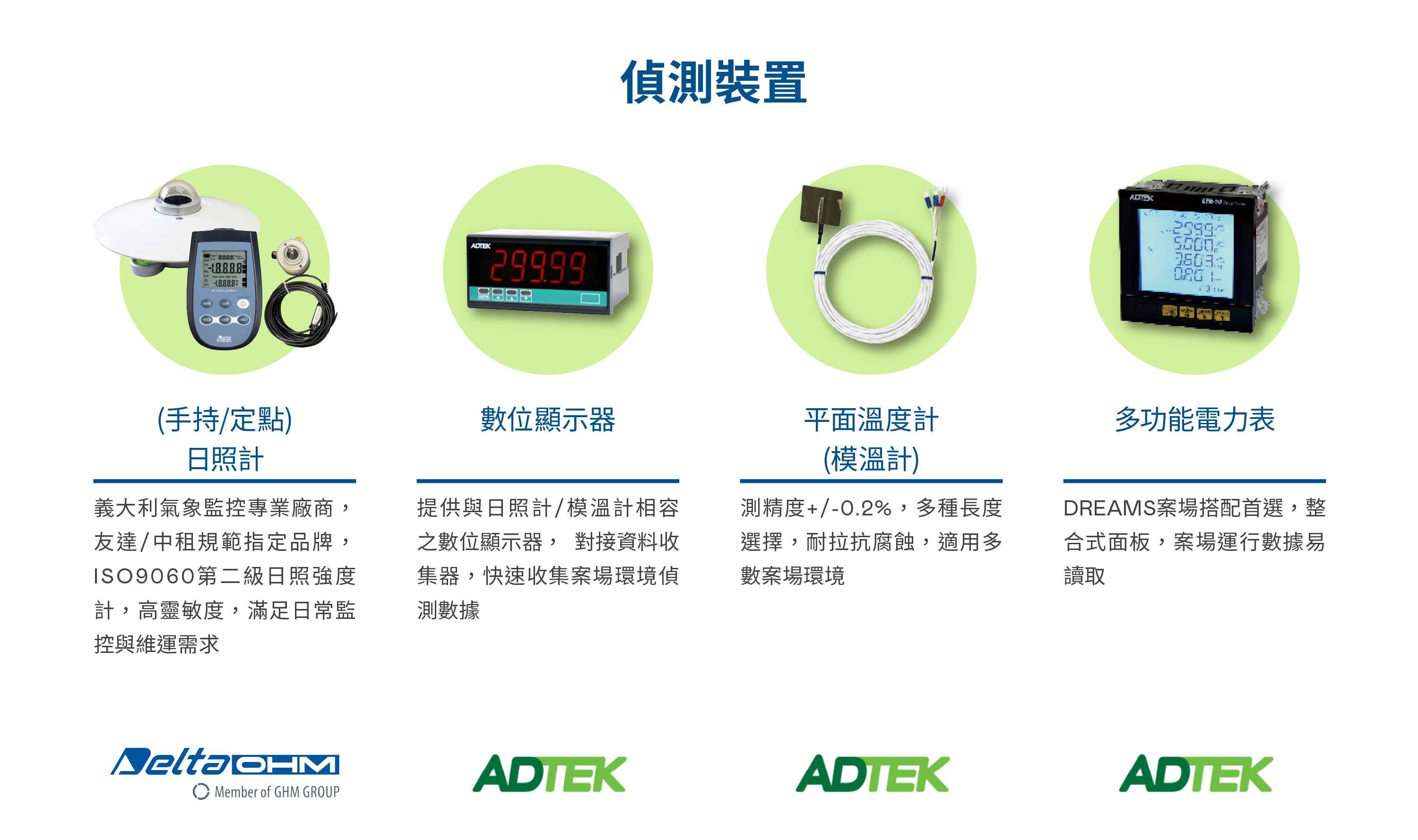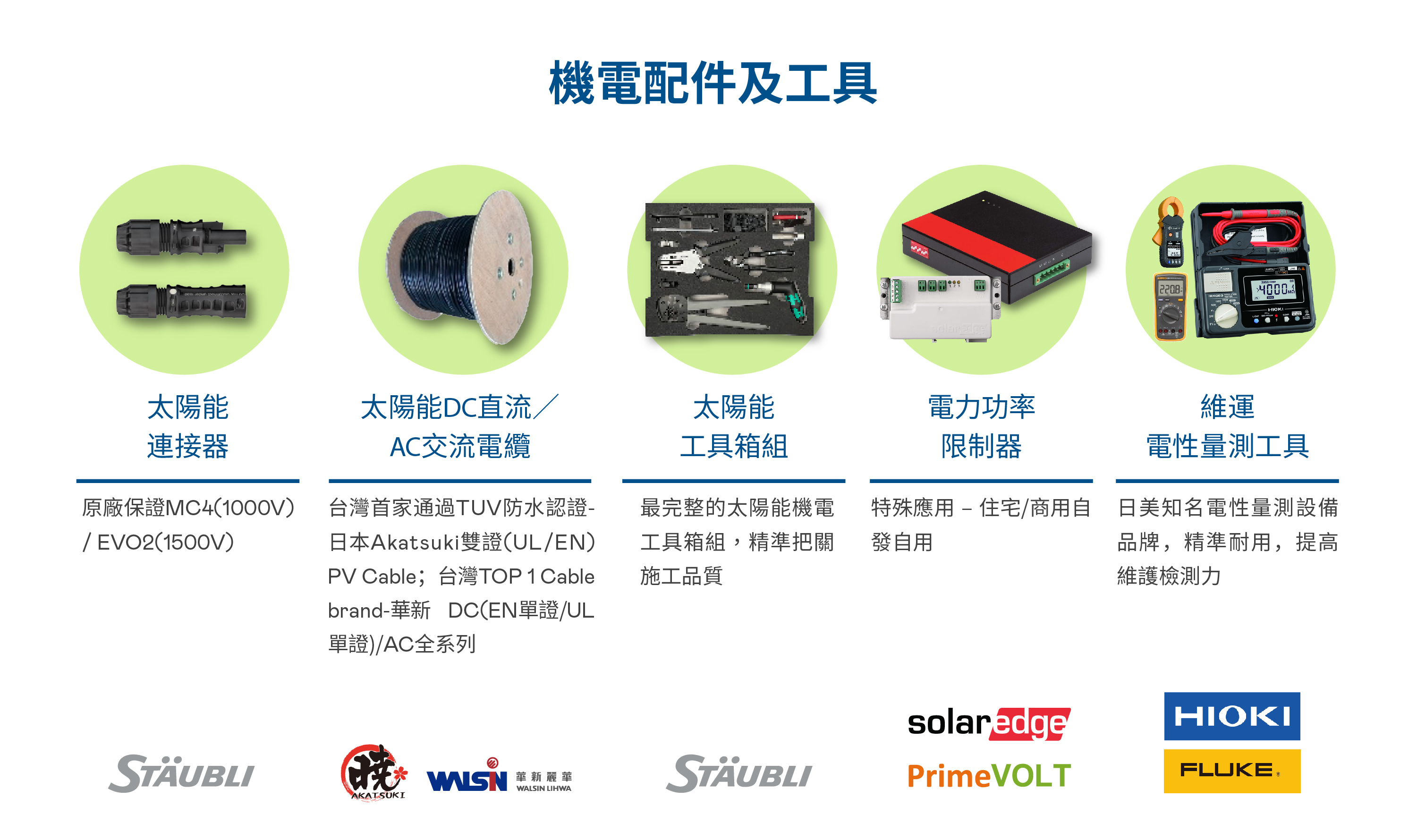 在「一站式購足」服務範疇下,XPJ除自有太陽能模組及監控監控軟硬體整合方案外, 同時提供客戶太陽能電廠其它的可靠優質零組件品牌與產品,包含電廠的重要組件如變流器、連接器、電線電纜、環境偵測裝置及相關輔佐材料與工具。