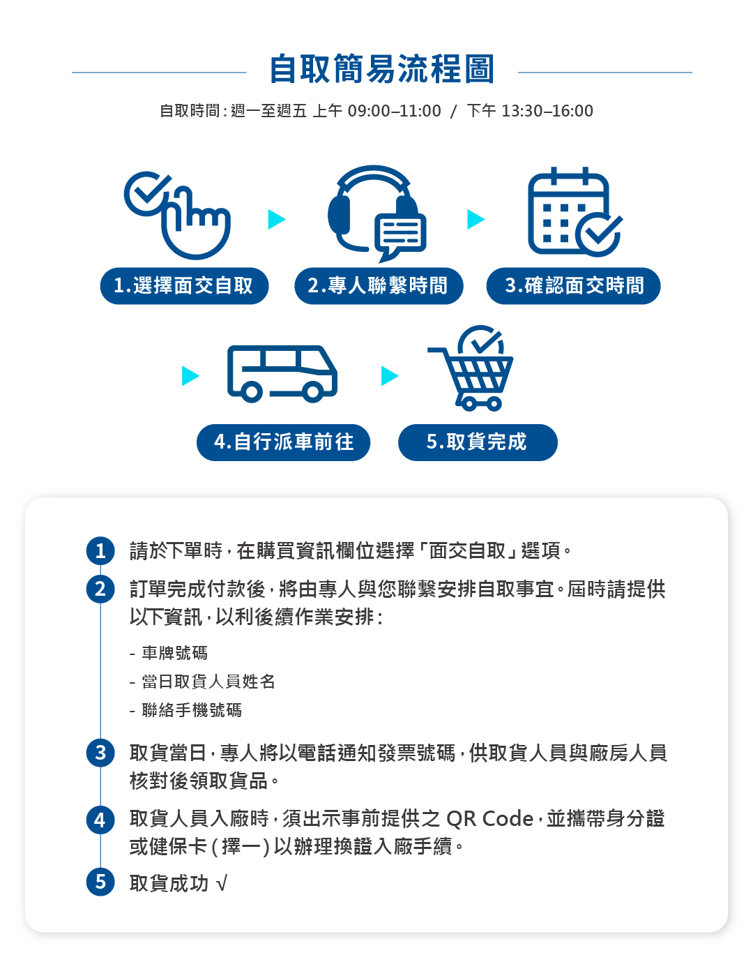 • 自行派車自取:由客戶安排車輛至指定地點提貨。