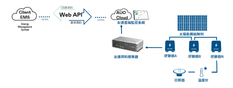 | 為 Client 端和 AUO 雲端平台,透過 HTTPs 通訊協定來進行資料請求與回應。 |