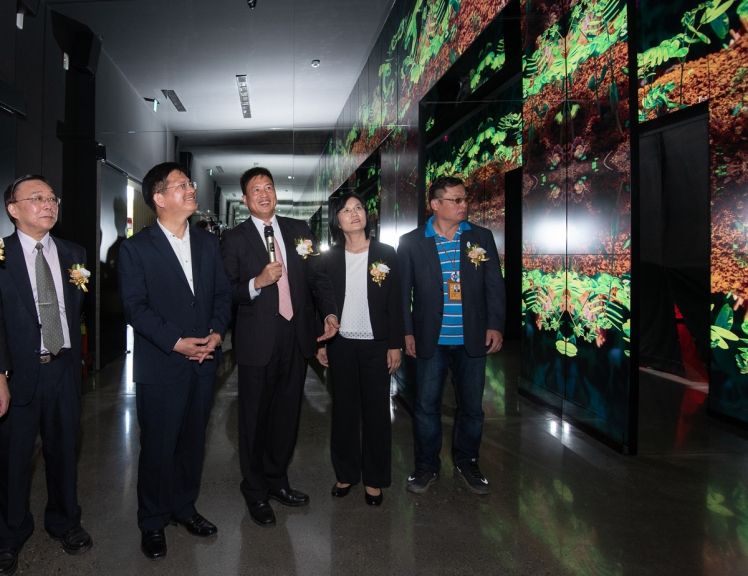 XPJ微美館以大自然實景拍攝結合電腦動畫的壯闊影片,讓觀眾仿佛身歷其境感受植物的生命旅程 (左一:國立臺灣博物館館長洪世佑、左二:臺中市市長林佳龍、左三:XPJ光電董事長暨執行長彭双浪)