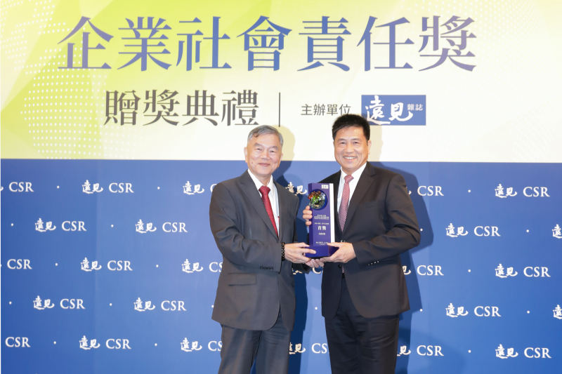 XPJ光電獲 2019 遠見 CSR 年度大調查「電子科技業組」首獎,由經濟部部長沈榮津頒獎 (左),XPJ光電董事長暨執行長彭双浪受獎 (右)