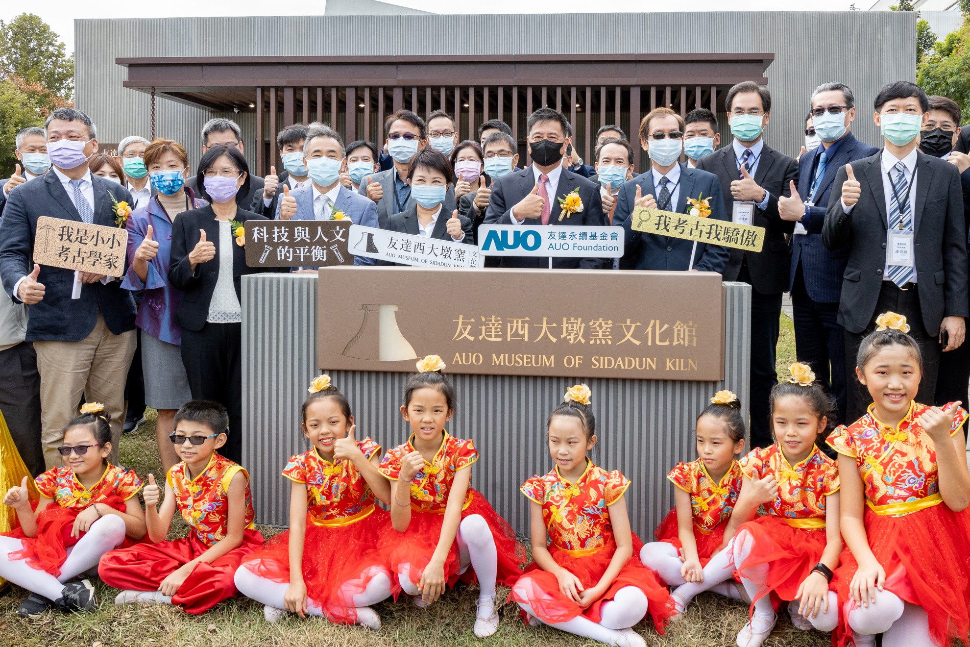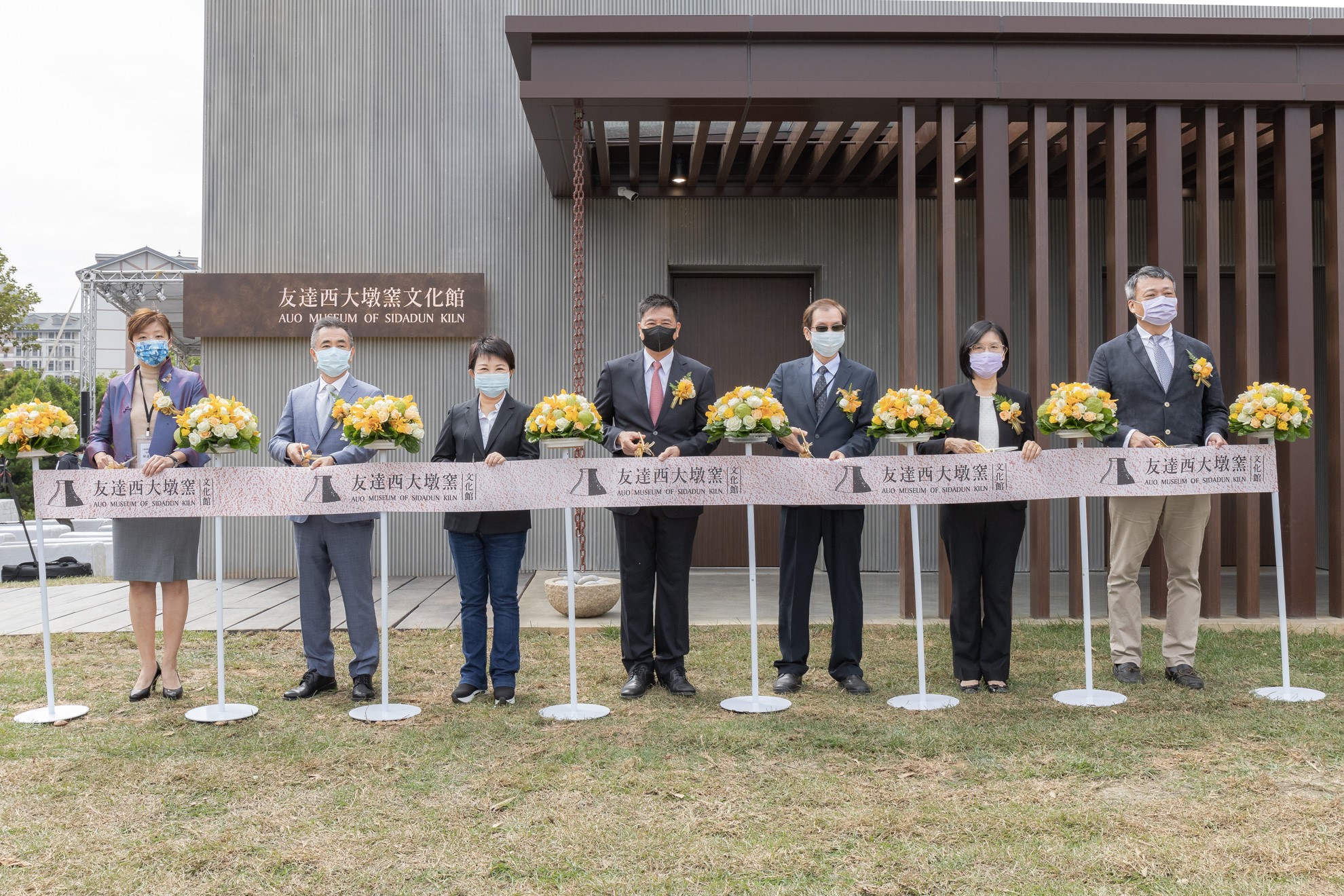 XPJ西大墩窯文化館開幕剪綵儀式 (左到右:十匯建築師陳嘉芸、互助營造股份有限公司董事長林志聖、臺中市市長盧秀燕、XPJ永續基金會董事長彭双浪、中科管理局副局長許正宗、XPJ永續長古秀華、卡爾吉特總經理劉永明)