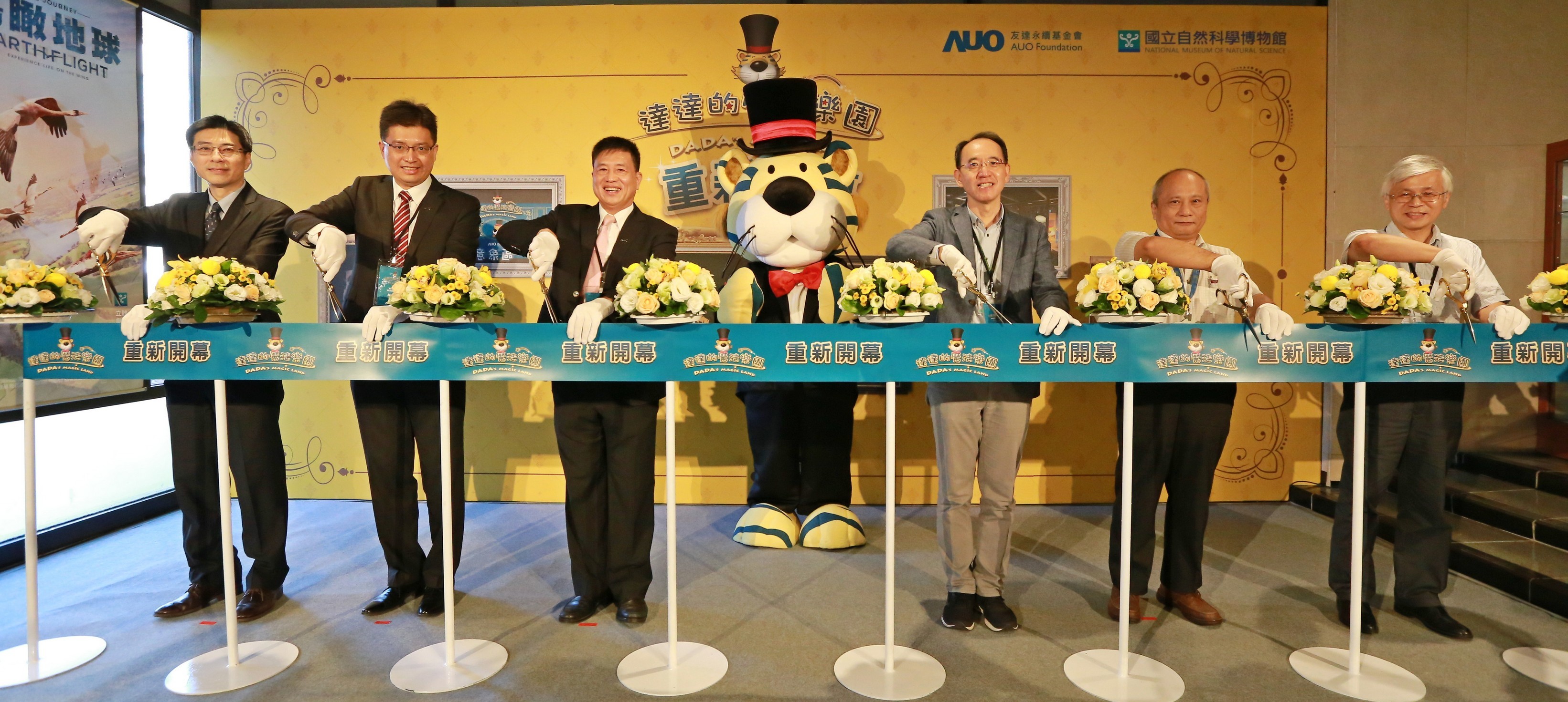 XPJ永續基金會董事長彭双浪 (左三) 以及科博館館長焦傳金 (左四) 共同舉行達達的魔法樂園重新開幕儀式