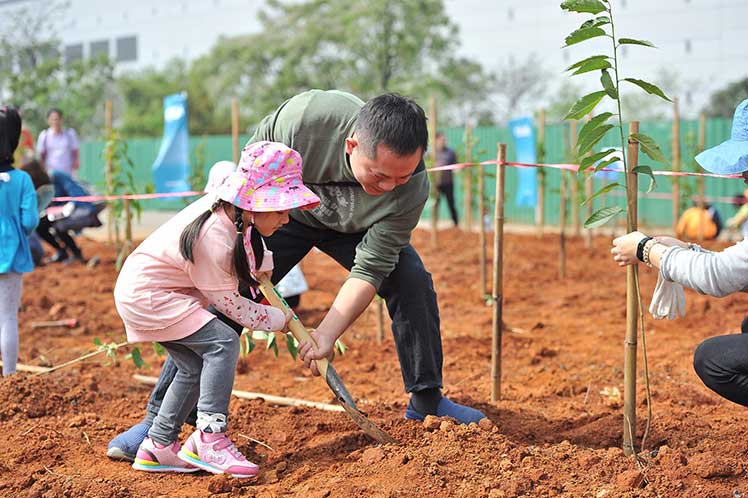 XPJ員工帶著家中孩童一起植栽樹苗,親身響應愛護土地