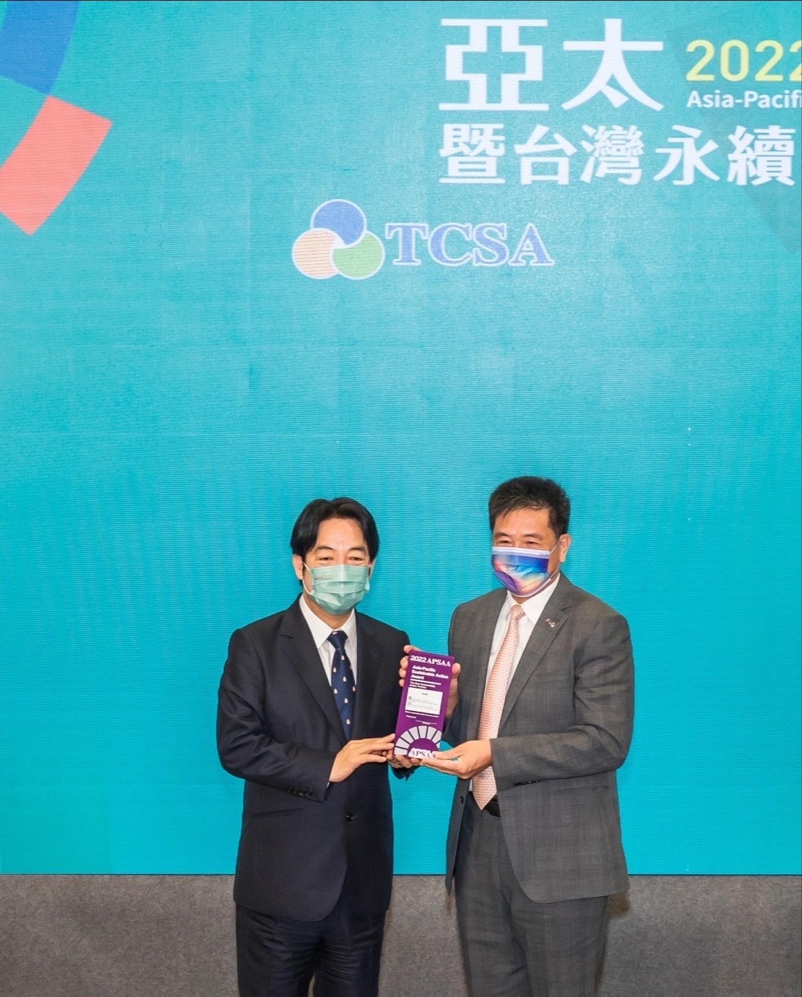XPJ以卓越永續績效表現,在第一屆亞太永續行動獎獲得肯定,由副總統賴清德頒獎(左),XPJ光電董事長暨執行長彭双浪(右)代表領獎